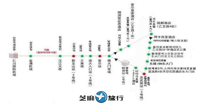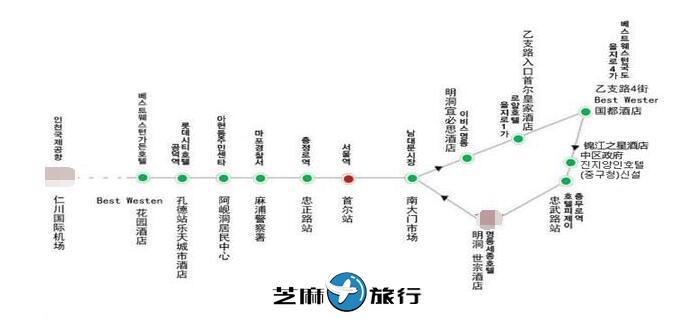仁川国际机场5B,12A站点 - Best Westen花园酒店 - 孔德站乐天城市酒店 - 阿岘洞居民中心 - 麻浦警察署 - 忠正路站 - 首尔站 - 南大门市场 - 明洞宜必思酒店 - 乙支路入口 首尔皇家酒店 - 乙支路4街 Best Westen国都酒店 - 锦江之星酒店(中区政府) - 忠武路站 - 明洞 世宗酒店