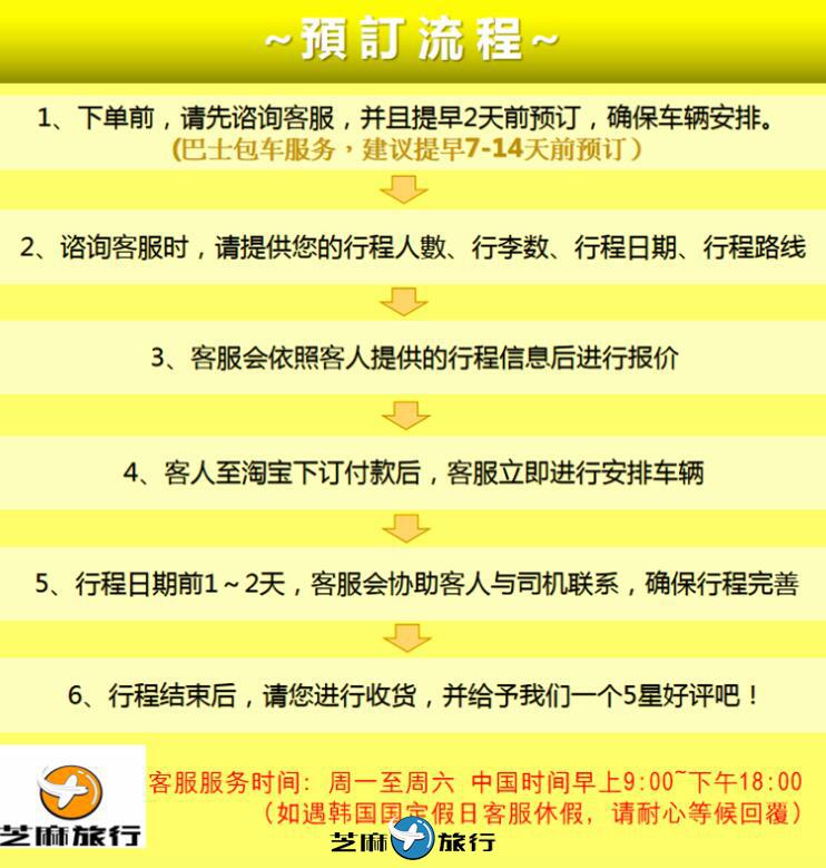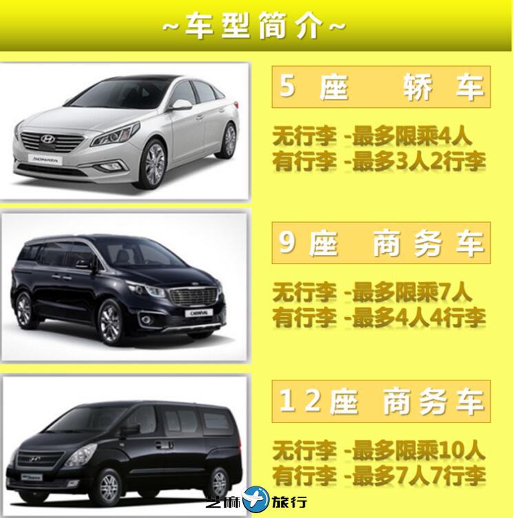 芝麻旅行社拥有5座轿车、9座商务车、11座商务车、12座商务车、25人巴士、35人巴士、45人巴士等韩国各种车型车辆。根据人数和行李不同提供车辆。